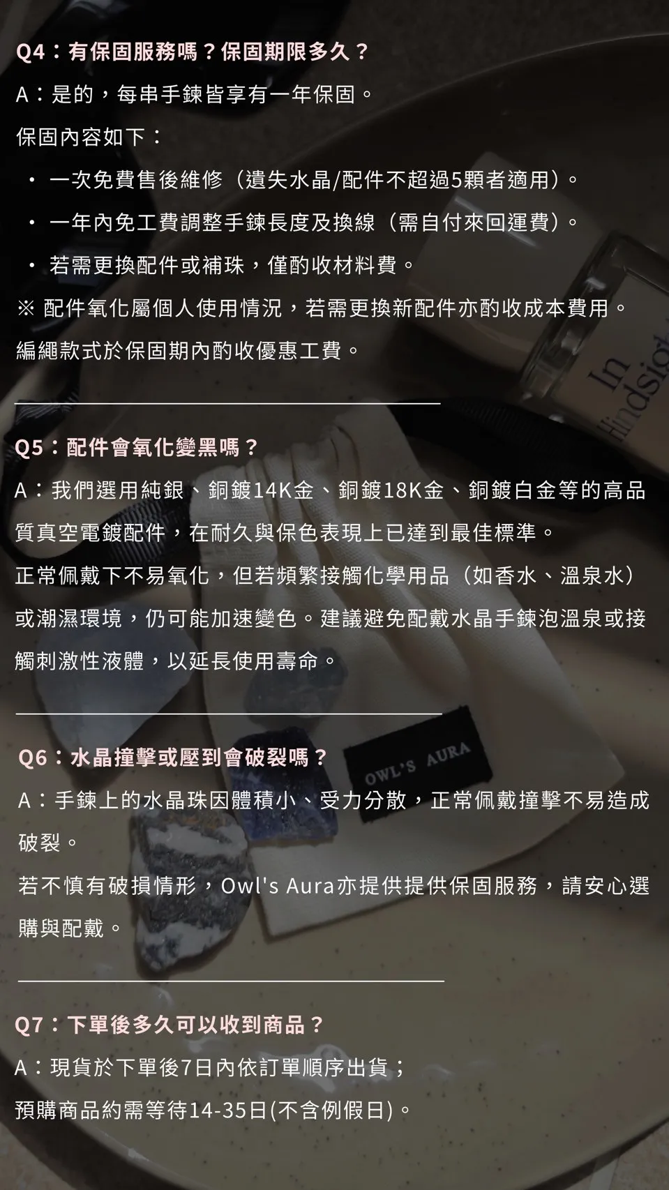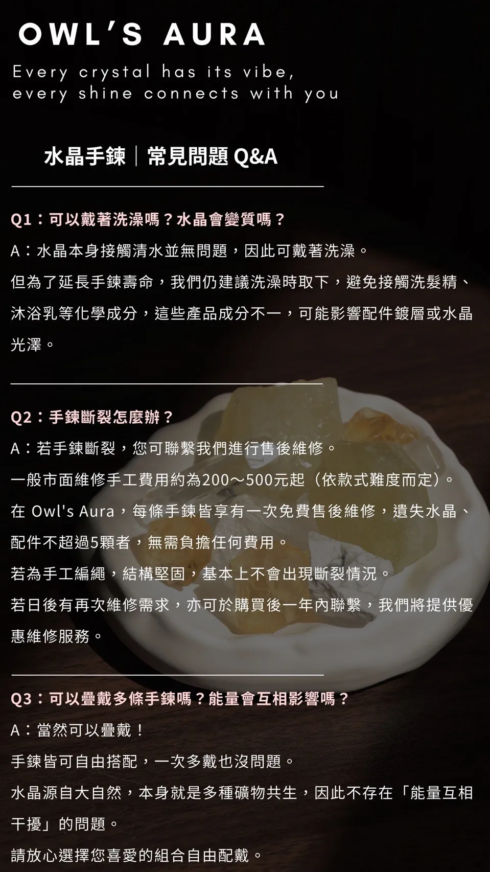每顆水晶皆為天然礦石,每一顆水晶的色澤、紋理都略有不同,